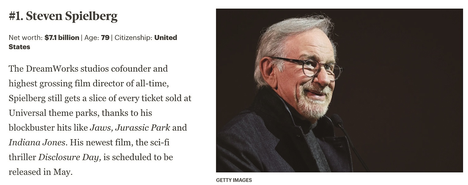 79岁的史蒂文·斯皮尔伯格以71亿美元的净资产登上《福布斯》2026年全球亿万富豪名人榜榜首。作为梦工厂联合...[详细]