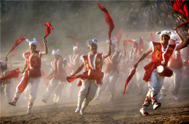 村民在陕西省延安市安塞区冯家营村文化大舞台为游客表演安塞腰鼓(2018年5月30日摄)。新华社记者 陶明 摄