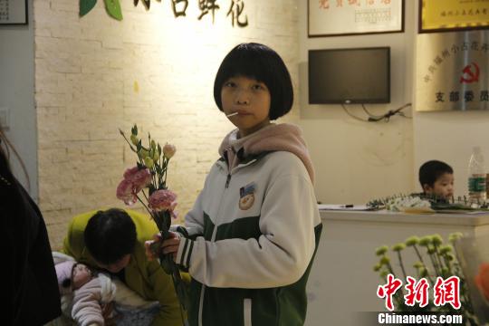 穿着校服的初中生在花店内选购鲜花。 彭莉芳 摄