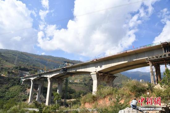 资料图:1月16日,由中铁隧道局集团承建的中(国)老(挝)国际大通道玉(溪)磨(憨)铁路立新寨四线特大桥顺利合龙,标志着中老铁路又一重点工程取得突破。中新社记者 刘冉阳 摄