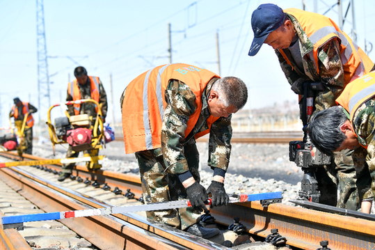 近日,大秦铁路进入春季检修阶段,中国铁路太原局集团有限公司大同工务段的工人们加紧施工,确保列车的安全运行。