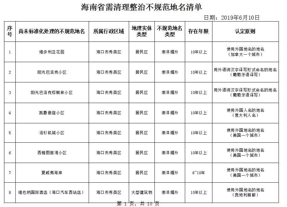 海南省需清理整治不规范地名清单(部分)图片来源:海南省民政厅