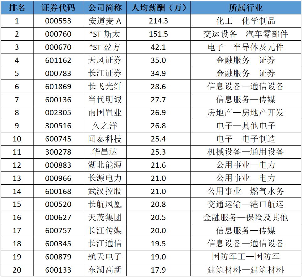 从上述行业分布可以看出,人均薪酬高的行业大多仍来自湖北省的优势行业,如电子、信息设备、信息服务业,这些公司大多体现出一个共同点,即公司员工人数少,以研发、销售类岗位为主,比如长江通信2018年拿薪酬的员工只有155人,久之洋只有303人,但他们创造的效益高,所以平均薪酬也较高;另一方面,传统的金融、房地产、建筑等行业,也是人均高薪酬比较集中的行业。