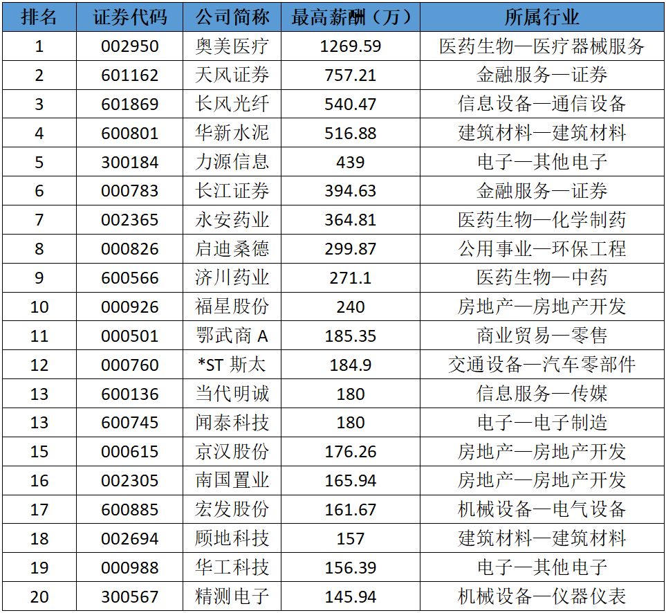 上表中,薪酬最高的公司最集中的行业是电子行业,有4家,其次是医药生物和房地产行业,分别为3家,建筑材料、机械设备、金融行业各2两家,其余的各只有1家。