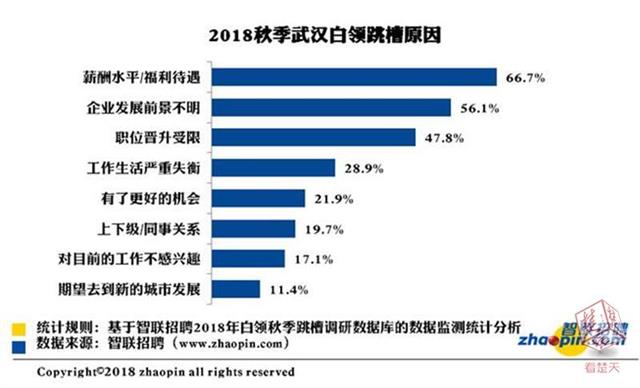 目前正是金九银十招聘季,白领进入新一轮的雇主选择周期。记者今天获悉,智联招聘《2018年武汉白领秋季跳槽及职业发展调研报告》显示,近六成受访者有跳槽行动,七成白领因薪酬水平跳槽,半数因企业发展前景跳槽。