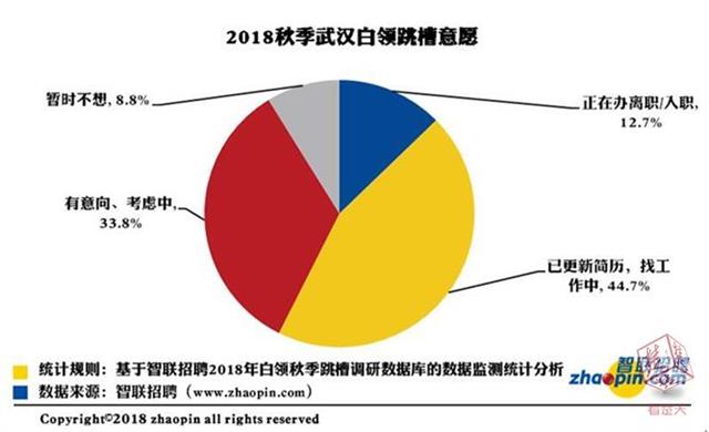 从智联招聘本次的调查结果可以看出,武汉地区有12.7%的白领已经着手准备办理离职或入职手续,44.7%的白领已经更新了简历,正在找工作;而有意向跳槽,还在犹豫观望的白领为33.8%。暂时不想的仅为8.8%。