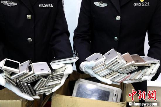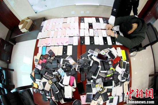1月24日,郑州铁路公安处召开新闻发布会,该处于近日摧毁了一个以盗刷被盗手机支付系统内资金的家族式犯罪团伙,现场查获手机389部,其中可用于盗刷的智能手机80部。韩章云 摄
