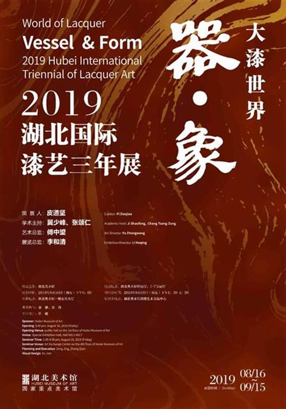 8月,《大漆世界:器·象——2019湖北国际漆艺三年展》将开展,展览时间为8月16日至9月15日,本届湖北国际漆艺三年展将以“大漆世界:器·象”为主题,意在以东方大漆媒介所作为的“犹天地之造化”的“器·象”,聚“气”为“场”,营造心理与精神时空,表达对诗意生活的追求向往。展览将延续往届以大漆为本体的学术坚持,进一步拓展国际交流平台、发掘优秀作品和新生力量。