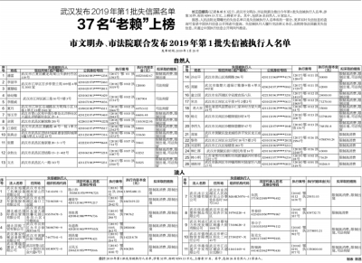 长江日报讯(记者朱丽兰)近日,武汉市文明办、市法院联合推出今年第1批失信被执行人名单,涉案32件、标的9299.13万元,上榜者37名。其中,包括26名自然人、11家法人。