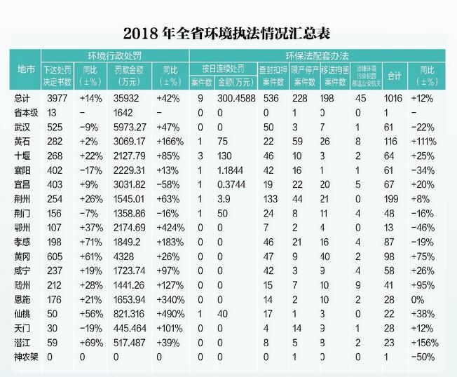 2018年,全省各地环保部门适用环境保护法四个配套办法和移送涉嫌犯罪案件数量共计1016件。与2017年同期相比,案件总数增长12%,限产、停产案件数增长56%,移送行政拘留案件增长31%。全省所有市州都有适用环保法配套办法的案件,实现了市州全覆盖。其中,宜昌、襄阳、黄石、十堰、荆门等5个市州环保法配套办法实现了各类型案件全覆盖;潜江、黄石、随州、黄冈等4个市州环保法配套办法的实施案件总数增长超过50%。