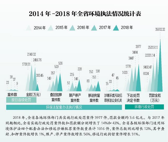 实施“环保法三年持续行动计划”,保持执法高压态势。2018年,全省各地环保部门共实施行政处罚案件3977件,同比增长14%;罚款金额约3.6亿元,同比增长42%。与2014年相比(新环境保护法于2015年1月1日起正式实施),处罚案件数增长145%,处罚金额增长496%。全省除3个直管市和神农架林区外,其他13个市州环境违法行为立案数全部过百,且处罚金额全部超过千万元。武汉、黄冈、黄石、宜昌4个市州处罚金额均超过了3000万元。