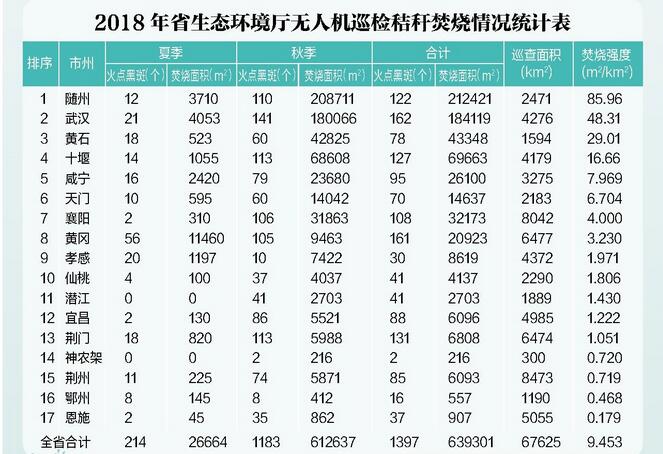 2018年,我省农作物秸秆露天禁烧和综合利用工作在全省各级政府和有关部门的共同努力下,取得明显成效,露天焚烧秸秆的行为得到进一步遏制。截至2018年12月24日,采用无人机对全省17个市州累计巡查面积67625平方公里,共发现火点/黑斑1397处,焚烧面积639301平方米,折合958.9亩,焚烧强度9.45。与2017年(巡查面积59690平方公里,发现火点黑斑1489个,焚烧面积1961929平方米,折合2941亩,焚烧强度32.86)相比,2018年巡查面积增加了11.7%,焚烧面积下降67.4%,焚烧强度降低了71.2%。秸秆露天焚烧连续3年呈逐年大幅下降,未发生因秸秆焚烧导致的大气污染突发事件。