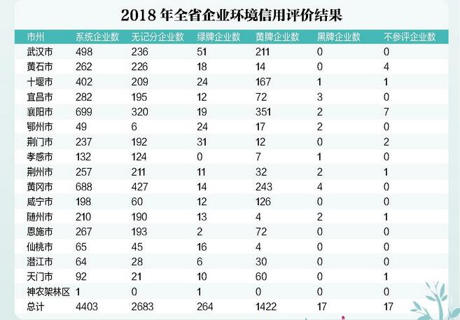 三是实现企业环境信用评价“全公开”。2018年初,启动了湖北省环境信用评价二期项目建设,并于当年9月份进行了项目验收,现已将全省范围内所有受到环保法及配套办法处理处罚的排污单位纳入企业信用评价系统。截至2018年12月底,全省纳入系统应参评企业数4403家,除15家企业因为关停、全年停产,2家企业注销、全年停产等原因无法开展评价外,以统一社会信用代码证为准最终确认参评的共计4386家。其中,国控企业416家,省控企业256家,市控企业853家,非重点企业2728家,自然人130。共264家企业申请了绿牌备案;1422家企业评为黄牌企业;17家企业评为黑牌企业,2683家企业无记分。