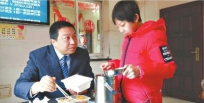 2月5日,公交531路司机王晨吃着工作餐,女儿在帮他添排骨藕汤通讯员邱慧明 摄