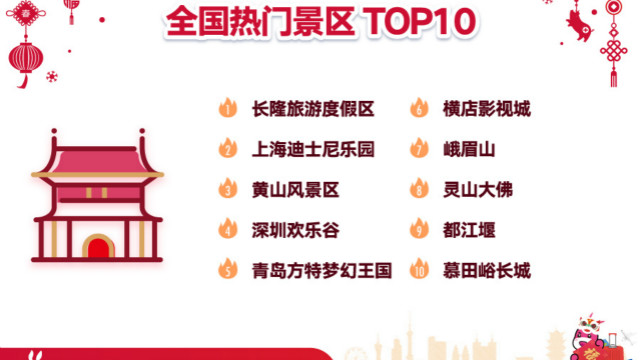 同程和驴妈妈方面统计显示,乡村游、农家乐、主题乐园、周边玩乐、温泉等出游主题需求旺盛,从全国主题景区范围来看,长隆旅游度假区、上海迪士尼乐园、黄山风景区、深圳欢乐谷、青岛方特梦幻王国、横店影视城、峨眉山、灵山大佛、都江堰、慕田峪长城等十大景区,在春节出游中热度最高。