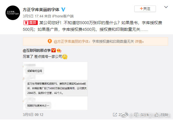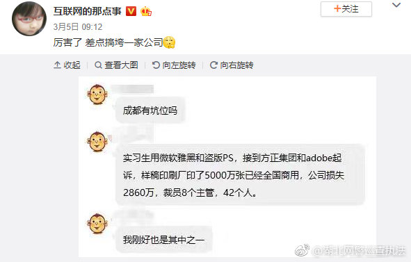 5日早间,微博名为“互联网的那点事”发博称,“厉害了,差点搞垮一间公司”,配图为一位爆料者称,某公司实习生使用微软雅黑和盗版PS,接到方正集团和adobe起诉,样稿印刷厂印了5000万张已经全国商用,公司损失2860万,裁员8个主管,42人,这位爆料者表示自己也是被裁掉的一员。