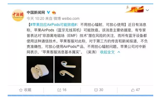 近日有消息称,苹果AirPods(蓝牙无线耳机)可能致癌。