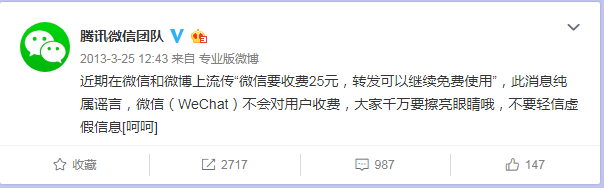 眼下,微信已经成为大多数网友日常沟通工具之一,一旦要收费,势必会引起广泛关注。但记者通过网络搜索发现,近期没有任何一家权威媒体发布过“微信要收费每月25元”的报道。而早在2013年3月25日,“@腾讯微信团队”就已通过微博发布辟谣信息:“近期微信和微博上流传‘微信要收费25元,转发可以继续免费使用’,此消息纯属谣言,微信不会对用户收费,大家千万要擦亮眼睛哦,不要轻信虚假信息。”