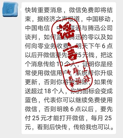 近日,微信群中流传一条“微信要收费每月25元”的信息。信息称:“快转重要消息,微信免费即将结束,据经济之声报道,中国移动、中国电信、中国联通与腾迅(编者注,原文如此,下同)公司谈判,如何监管腾迅的零以及如何向零业务收费,明天下午6点以后开微信要先付25元钱……”该信息还表示,只要把这个消息传给10个人,证明自己是经常使用微信的用户,系统就会升级更新,“否则你将被删除,如果传送超过18个人,你的图标会变成蓝色,代表你可以继续免费使用微信,否则明晚6点以后,要先付25元才能打开微信,每月25元,看到后快传,传给我也可以”。这是真的吗?