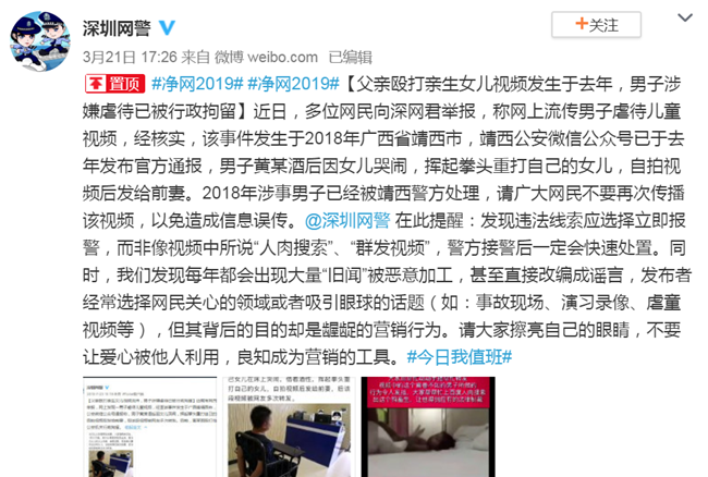 近日,网上流传一段“男子殴打女童”的视频,并配文称:“大家动动手指帮忙转发,视频中这个禽兽不如的男子所做的行为令人发指,大家帮帮忙上百度人肉搜索出这个人,让他得到应有的法律制裁。恳请大家,把视频转发到所有群,让警方介入此事。”该视频引发广泛关注,不少网友转发视频希望帮助小女孩。昨晚,“@深圳网警”发文对此澄清,视频中的事件发生于2018年广西省靖西市,涉事男子早已经被靖西警方处理,请广大网民不要再次传播该视频,以免造成信息误传。