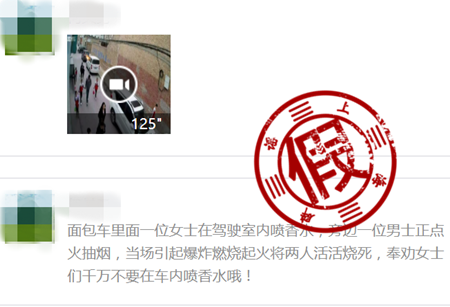 近日,多地网友的微信群中流传一段“面包车爆炸起火”的视频。这段视频截取自一段监控录像,视频画面显示,一辆白色面包车停在街道一侧,不少家长正带着孩子从一旁走过。突然这辆白色面包车发生爆炸,不断冒出火光和烟雾。几名路人找来工具砸开车窗试图救人,但面包车此时燃起大火,周围人无法再靠近。随视频一同转发的文字称:“面包车里面一位女士在驾驶室内喷香水,旁边一位男士正点火抽烟,当场引起爆炸燃烧起火,将两人活活烧死。”
