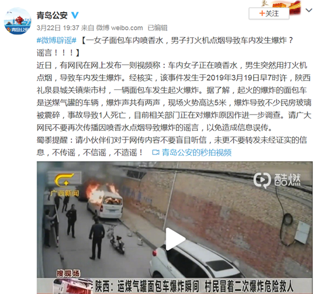目前,当地有关部门正在对事故原因进行进一步调查。但是,网传的“女子车内喷香水,男子点烟致两人被烧死”的说法明显为谣传。近日,多地网警针对网上的传言进行了辟谣。“@青岛公安”“@淄博网警巡查执法”等地警方微博账号表示,近日网上流传的“一女子面包车内喷香水,男子打火机点烟导致车内发生爆炸”视频为谣言,并请广大网民不要再次传播因喷香水点烟导致爆炸的谣言,以免造成信息误传。