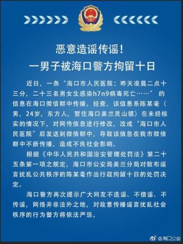中新网3月30日电 近日,一条“海口市人民医院有23名男女生感染h7n9病毒死亡”的信息在海口微信群中传播。海南省海口市公安局官方微博30日辟谣称,该信息系陈某毫在未经核实的情况下,对网传信息进行修改后发送到微信群中,已对其作出行政拘留十日的处罚决定。