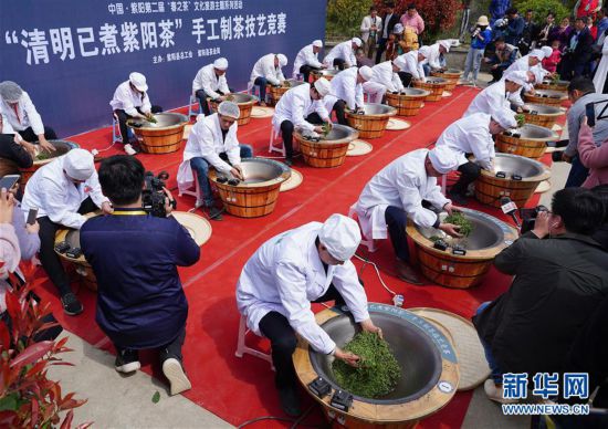 手工茶制作技艺大赛在紫阳县向阳镇合垭村一处茶园里举行(3月31日摄)。 时下,陕西安康市紫阳县进入春茶采摘期,当地举办系列文化旅游活动,吸引游客上茶山游玩,享受田园惬意。近年来,紫阳县依托茶园基地建设着力打造生态观光园,积极推动茶旅融合发展,取得良好效果。 新华社记者 邵瑞 摄