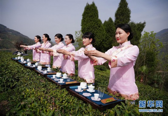 3月31日,表演者在紫阳县向阳镇合垭村一处茶园内展示茶艺。 时下,陕西安康市紫阳县进入春茶采摘期,当地举办系列文化旅游活动,吸引游客上茶山游玩,享受田园惬意。近年来,紫阳县依托茶园基地建设着力打造生态观光园,积极推动茶旅融合发展,取得良好效果。 新华社记者 邵瑞 摄
