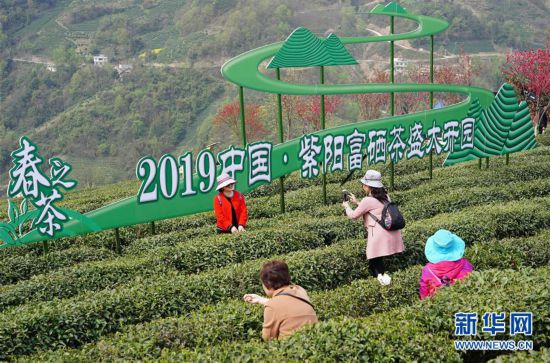 3月31日,游客在紫阳县向阳镇合垭村一处茶园游玩拍照。 时下,陕西安康市紫阳县进入春茶采摘期,当地举办系列文化旅游活动,吸引游客上茶山游玩,享受田园惬意。近年来,紫阳县依托茶园基地建设着力打造生态观光园,积极推动茶旅融合发展,取得良好效果。 新华社记者 邵瑞 摄