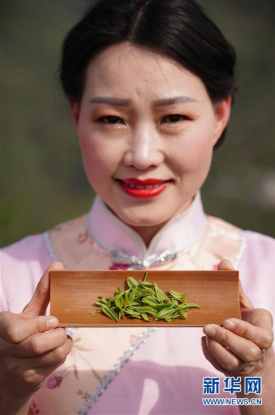 3月31日,在紫阳县向阳镇合垭村一处茶园里,茶艺表演人员展示新采摘的茶叶嫩芽。 时下,陕西安康市紫阳县进入春茶采摘期,当地举办系列文化旅游活动,吸引游客上茶山游玩,享受田园惬意。近年来,紫阳县依托茶园基地建设着力打造生态观光园,积极推动茶旅融合发展,取得良好效果。 新华社记者 邵瑞 摄