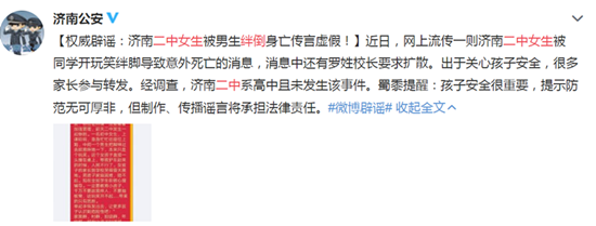 3月23日,山东“@济南公安”对网传信息进行了辟谣:“近日,我市微信群中流传着一则济南二中女生被同学开玩笑绊脚导致意外死亡的消息,出于关心孩子安全的角度考虑,很多家长参与转发。据调查,济南二中并未发生该事件,也没有罗姓校长。”