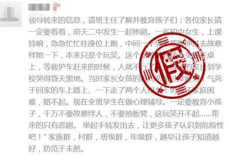 近日,一条“二中发生惨剧,一名初中女生被绊倒身亡”的消息在多地网友的微信群内传播。传言内容称:“各位家长请一定要看看,前天二中发生一起惨剧。一名初中女生,上课铃响,急急忙忙往座位上跑,中间一个男生把脚伸过去故意绊她一下,本来只是个玩笑。这个女孩子直接一头撞在桌上,等救护车赶来的时候,人就不行了。女孩子的家长到学校哭得昏天黑地,气死于回家的路上,一下走了母女两个人……举起手转发出去,让更多孩子认识到危险性吧!”