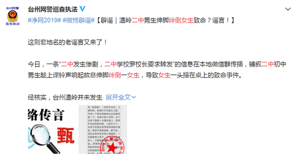 3月15日,浙江“@台州网警巡查执法”也表示,“温岭二中男生伸脚绊倒女生致死”的消息是一条套地名的老谣言,台州温岭并未发生相关事件。警方发现,类似传言已在各类媒体平台散播多年,已被多地警方证实为虚假信息。