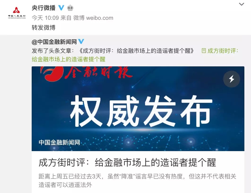 2日,央行官方微博转发中国金融新闻网一篇名为《成方街时评:给金融市场上的造谣者提个醒》的评论文章,对于央行“4月1日起降准”的谣言,文章表示央行已正式致函公安机关,请就依法进行查处。