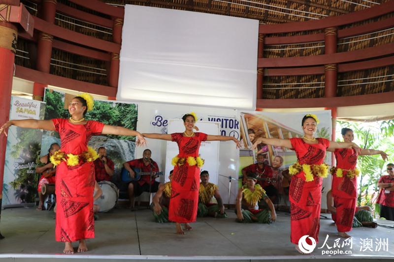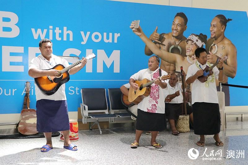 首都阿皮亚国际机场的欢迎仪式 男人们身着裙装(摄影 王泉骄)