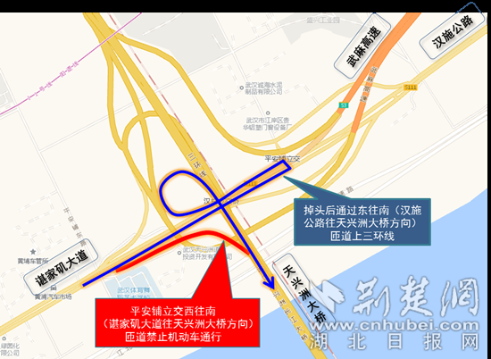 2019年4月16日至2019年6月5日,平安铺立交西往南(谌家矶大道往天兴洲大桥方向)匝道禁止机动车通行。