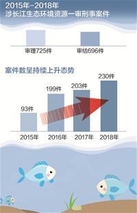 2015年至2018年,全省法院共审理涉长江生态环境资源一审刑事案件725件,审结696件。案件数呈持续上升态势,其中,2015年收案93件,2016年199件,2017年203件,2018年230件。