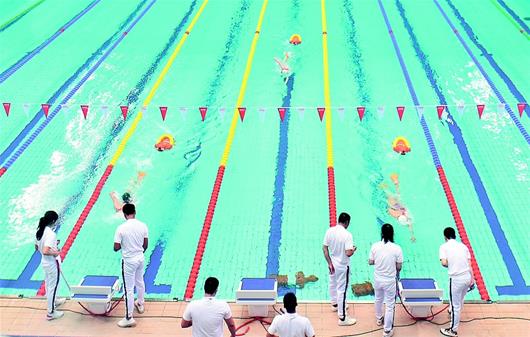 6月8日,第七届世界军人运动会水上救生测试赛,在位于武汉临空港经开区(东西湖区)的武汉五环体育中心游泳馆开赛,26名参赛选手在50米假人救生、4×50米障碍游泳接力和200米超级救生等18个项目中进行角逐。通过测试赛,将对军运会水上救生场馆进行全方位检测。(湖北日报全媒记者倪娜通讯员宋亮摄)