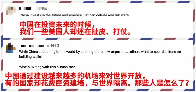 “中国通过建设越来越多的机场来对世界开放,有的国家却花费巨资建墙,与世界隔离。那些人是怎么了?”