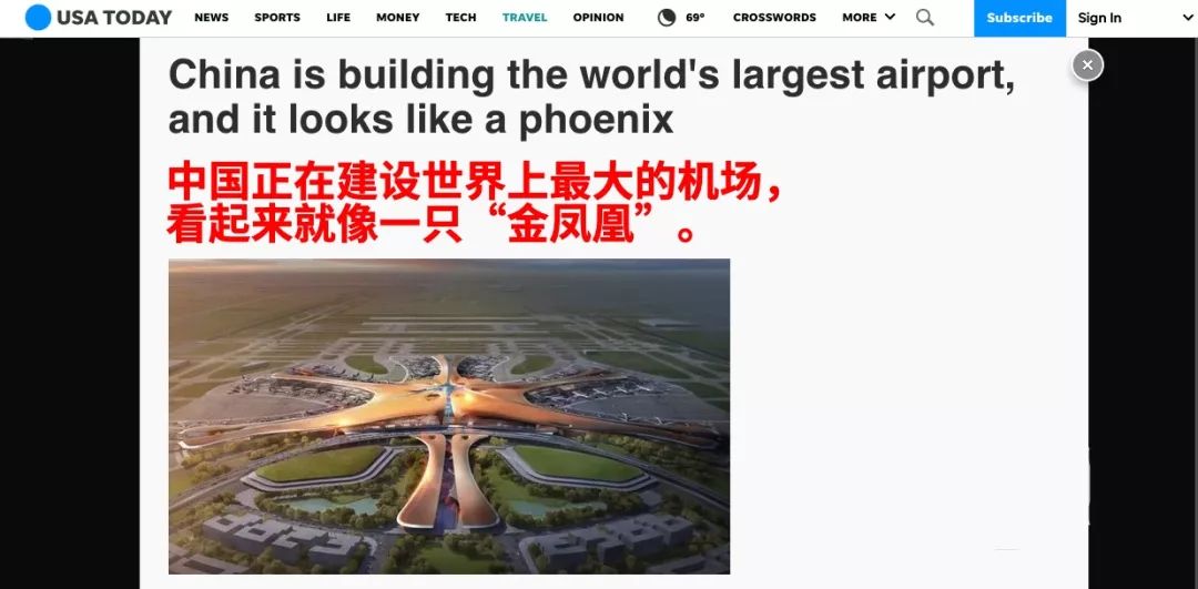 《今日美国报》则形容,建成后的大兴国际机场好似一只展翅飞翔的凤凰,金光闪闪,格外耀眼。