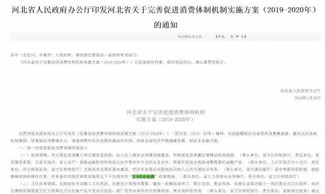 2019年1月,据河北省政府网站消息,河北省印发《河北省关于完善促进消费体制机制实施方案(2019-2020年)》(简称《方案》),《方案》提出,落实带薪休假制度,鼓励错峰休假和弹性作息,在有条件的地区探索实施周五下午加周末的“2.5天小长假”政策措施。