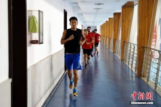 7月8日,徐嘉余与队友们一起跑步热身。当日,国家游泳队在国家体育总局游泳训练馆举行公开训练课。中新社记者 韩海丹 摄