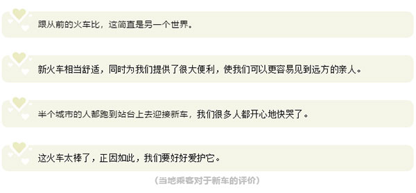 新车投入运营后,大大改善了从前古巴火车“破旧”、“脏乱”的现象,“舒适”成为车厢内乘客几乎一致的评价。