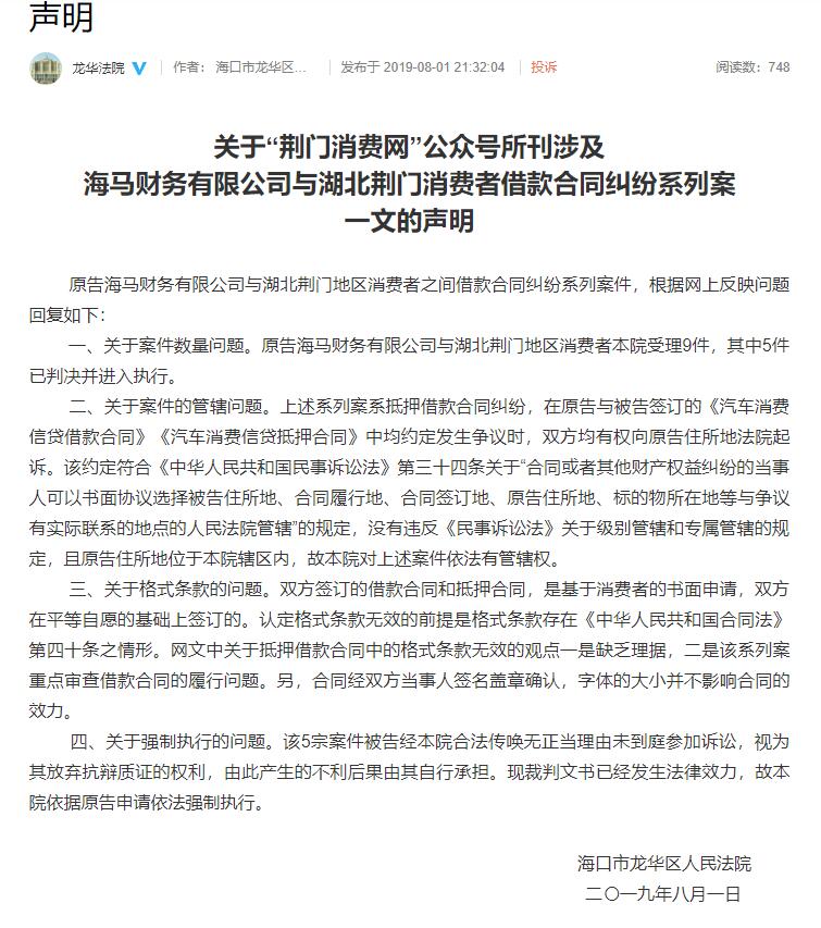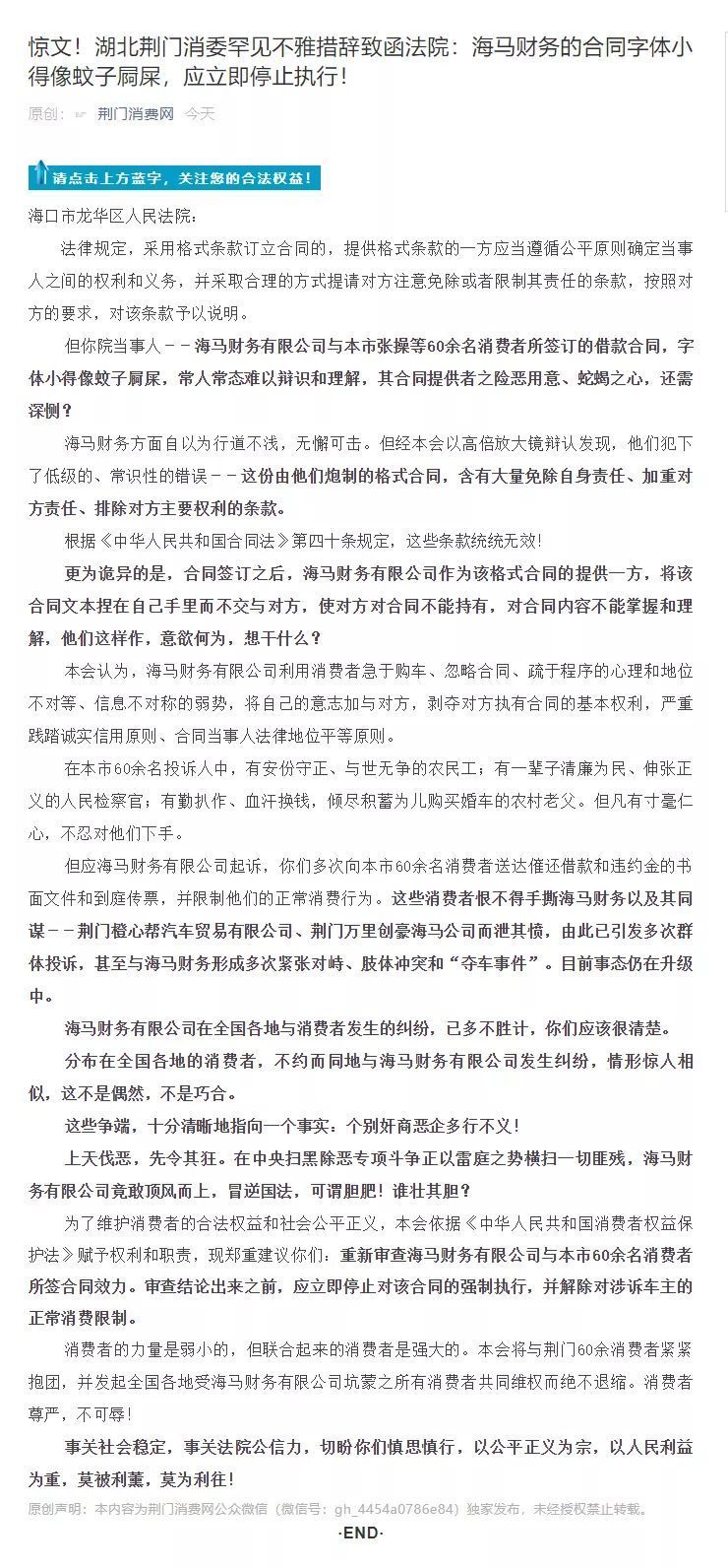 湖北荆门市消费者委员会7月31日通过微信公号,“霸气”致函海南省海口市龙华区人民法院,建议该法院“重新审查海马财务有限公司与本市60余名消费者所签合同效力。审查结论出来之前,应立即停止对该合同的强制执行,并解除对涉诉车主的正常消费限制”。