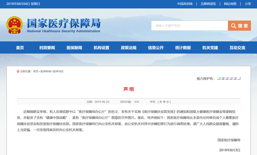 近期接群众举报,有人在微信群中以“医疗保障局办公厅”的名义,发布关于实施《医疗保障扶贫款发放》的通知和领取大健康医疗保障金等虚假信息,并配发了含有“健康中国战略”、盖有“医疗保障局办公厅”图章的文件图片。鉴此,特声明如下:国家医疗保障局从未委托任何单位或个人筹集医疗保障扶贫资金和发放医疗保障扶贫款。国家医疗保障局已向公安机关报案,由公安机关对其中涉嫌犯罪行为进行调查处理。请广大人民群众提高警惕,谨防上当受骗,一旦发现线索及时向公安机关报案。