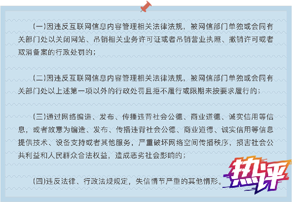 近日,国家互联网信息办公室起草了《互联网信息服务严重失信主体信用信息管理办法(征求意见稿)》(以下简称征求意见稿),并向社会公开征求意见。根据征求意见稿,互联网信息服务提供者和使用者有下列情形之一的,网信部门认定为互联网信息服务领域严重失信行为,行为主体列入互联网信息服务严重失信主体黑名单。