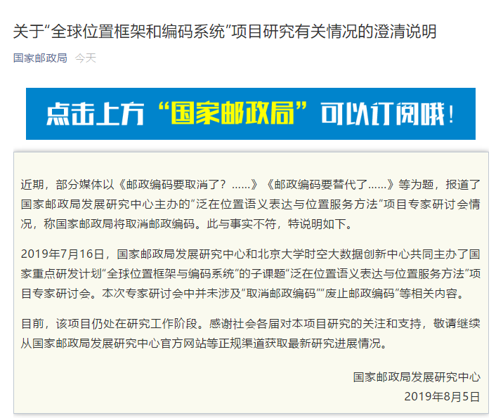 近期,部分媒体以《邮政编码要取消了?……》《邮政编码要替代了……》等为题,报道了国家邮政局发展研究中心主办的“泛在位置语义表达与位置服务方法”项目专家研讨会情况,称国家邮政局将取消邮政编码。此与事实不符,特说明如下。