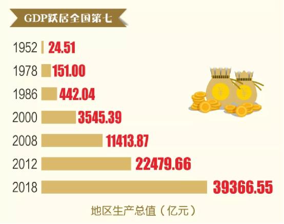 经济体量规模持续扩大。新中国成立初期的1952年,湖北生产总值仅为24.51亿元,1978年则达151亿元。改革开放后发展步伐加快,2018年达39366.55亿元。其中,在2008年、2012年分别进入1万亿、2万亿俱乐部,并于2016年突破3万亿元大关。从在全国位次看,1978年、1988年、1998年、2008年均居第10位。十八大以后竞进态势明显,2012年进居全国第9位,2015年挺进全国第8,恢复到历史最高水平,2016年第一次跻身全国第7,在中部仅次于河南,创新中国成立以来最好水平,2017年以来持续保持全国第7。