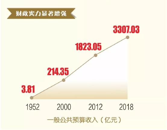 财政实力显著增强。2018年,全省地方一般公共预算收入达到3307.03亿元,比1952年增加了3303.22亿元。尤其是继2010年全省地方一般公共预算收入首次突破千亿元后,2013年、2015年又分别突破了2000亿元、3000亿元大关。十八大以来,2018年地方一般公共预算收入比2012年增加了1483.98亿元,增长81.4%。